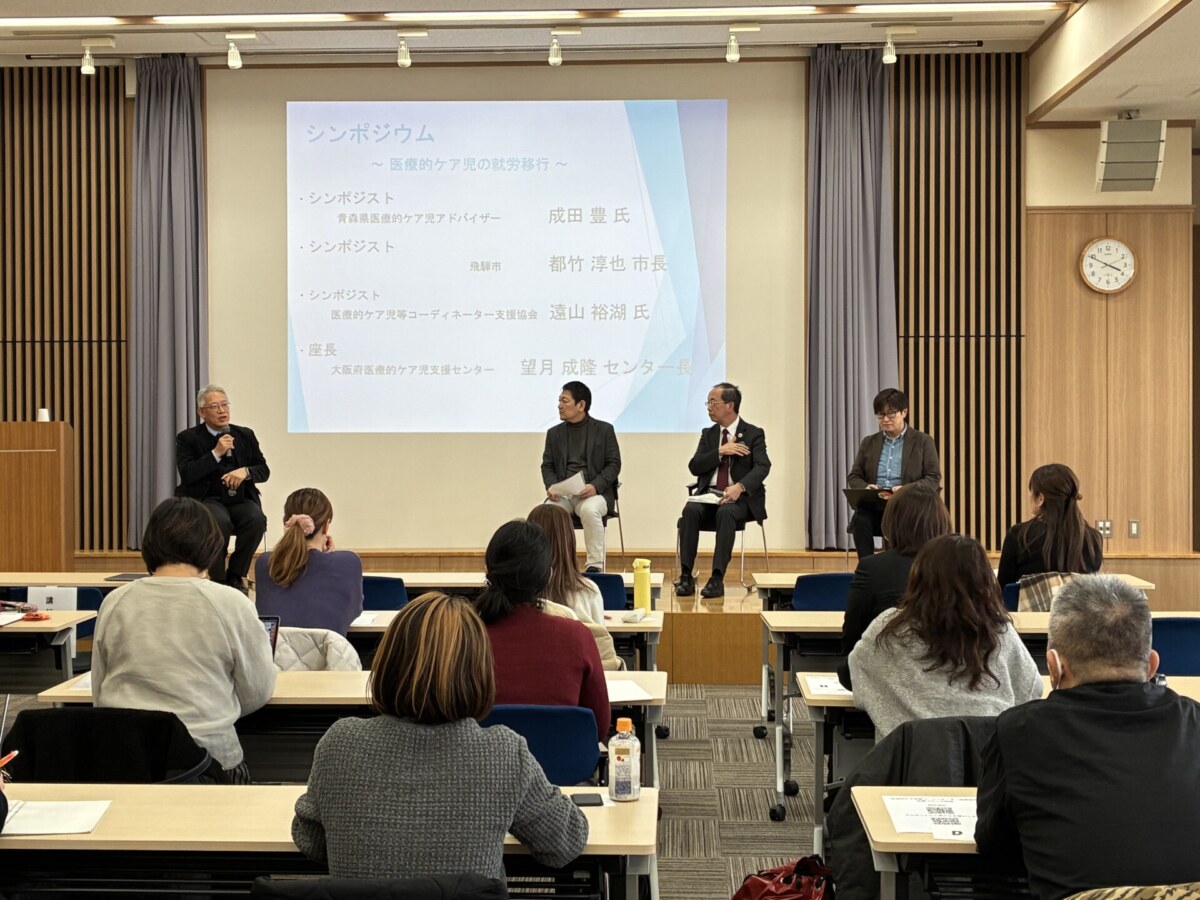 続くシンポジウムでは、大阪府医療的ケア児支援センターの望月センター長が座長を務め、登壇者それぞれの立場から就労移行に向けた思いや支援のあり方についてお話しいただきました。また、グループワークでは他地域の取り組みや、これから必要となる支援について参加者同士で意見交換を行いました。多様な視点に触れることで、これからの取り組みを考える良い機会となり、大きな刺激となりました。(G)