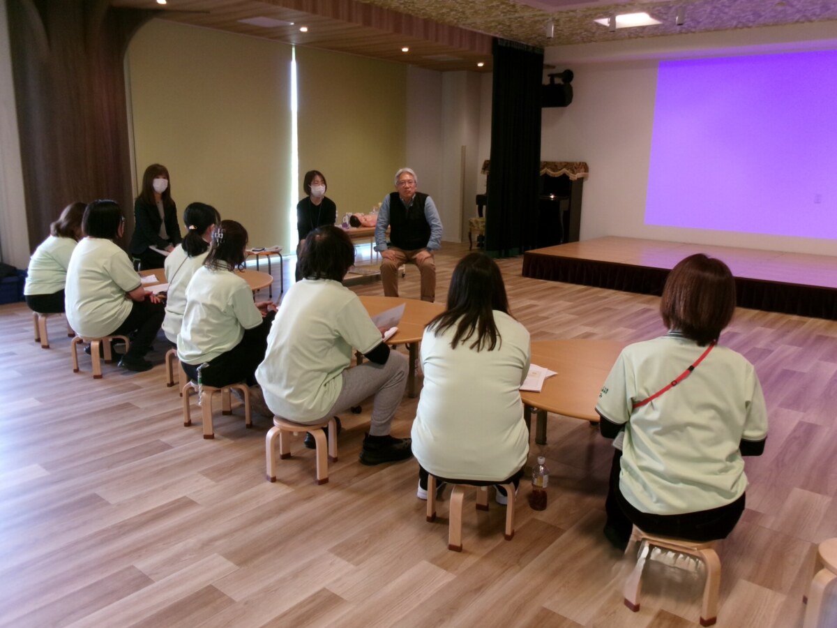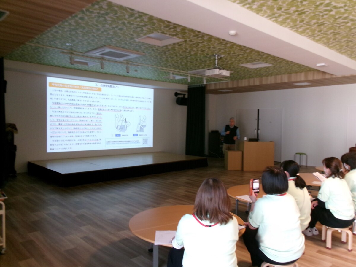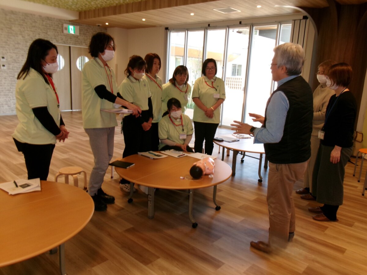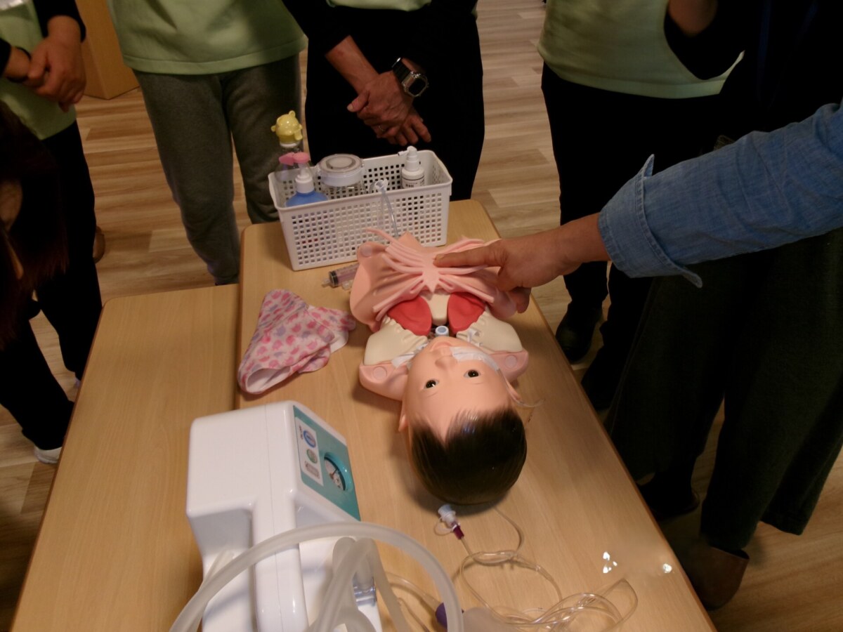令和8年度より新設される、「幼保連携型認定こども園 障がい児通所支援事業所くるみ」にて、医療的ケア児について知っていただくための研修会を実施いたしました。こども園並びに障がい児通所支援事業所におられる保育士さんや看護師さんをはじめ、スタッフの皆さんが、医療的ケア児について学び、医療的ケア児を安心して受け入れることを目的として開催し、園の方9名と市役所の担当課の方2名を合わせて11名の方が研修を受けられました。講義に加え、医ケア児モデル人形を使用して気管切開、経管栄養(経鼻・胃ろう)を必要とする児の状態や、経管栄養セット、気管カニューレ、吸引器を実際に見て触っていただきました。その後の質疑応答でも、全般的なことから個別ケースでの対応のことなど、質問や不安に思っていることを話してくださり、それにお応えすることで、医療的ケア児について多角的に知っていただく機会となりました。当センターでは、保育園やこども園をはじめ、さまざまな事業所や機関に対し、医療的ケア児を受け入れるにあたっての研修を無料で実施しています。どうぞお気軽にご相談ください。